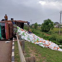 राष्ट्रीय राज्य मार्ग 53 में रायपुर से महासमुंद की ओर जा रही ट्रक क्रमांक CG-04 8796 अचानक टायर फटने से अनियंत्रित होकर पलट गई जिसमें ड्राइवर पूरी तरह सुरक्षित है ट्रक के पलटने से मैदे की बोरियां रोड के बाजू में बिखर गई है जिसे समेटने का काम जारी है