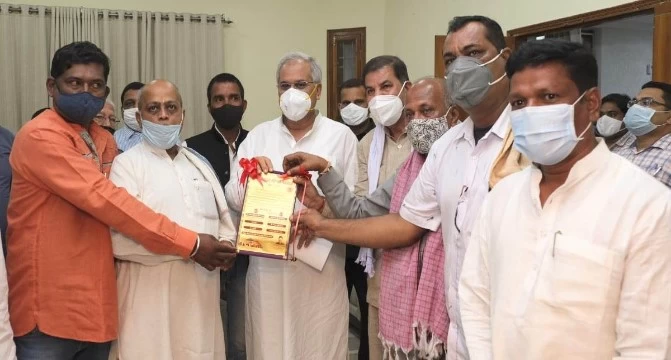 मुख्यमंत्री भूपेश बघेल से आज शाम यहां उनके निवास कार्यालय में अध्यक्ष ईश्वर नाथ खम्बारी के नेतृत्व में आए 360 घर आरण्यक ब्राम्हण समाज के प्रतिनिधिमंडल ने सौजन्य मुलाकात कर उन्हें बस्तर गोंचा महापर्व-2021 में शामिल होने आमंत्रण पत्र सौंपा।प्रतिनिधिमंडल ने मुख्यमंत्री को भगवान को सलामी देने के लिए बजाया जाने वाला बस्तर का पारम्परिक वाद्य तुपकी और पेंग भेंट किया। मुख्यमंत्री भूपेश बघेल ने पारम्परिक अंदाज में तुपकी वाद्य में स्थानीय तौर पर पेंग कहलाने वाले मलकांगिनी बेल के बीज को भरकर कर इसे बजाया और बस्तर गोंचा महापर्व में आने का न्यौता सहर्ष स्वीकार किया।