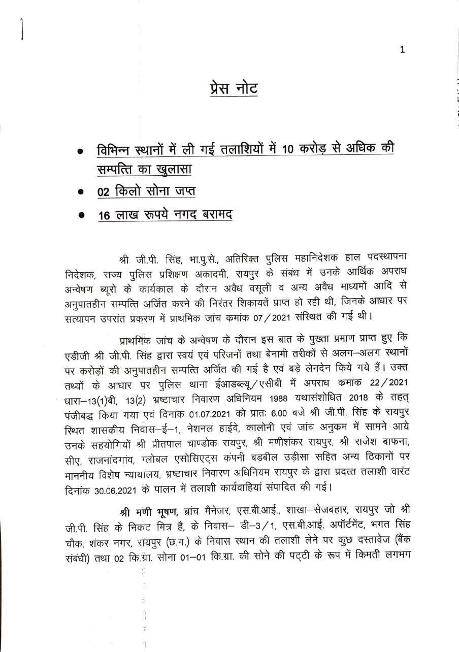 एडीजी जीपी सिंह के अलग अलग ठिकानों पर एसीबी के छापे में 10 करोड़ रुपए से अधिक की चल अचल संपत्ति का पता चला है। इसके अलावा 2 किलो सोना मिला है। साथ ही छापेमारी में 16 लाख रुपया नगद बरामद हुआ है। इसके अलावा कई बेनामी संपत्तियों का भी पता चला है। जिसकी जांच अभी की जा रही है।एसीबी और ईओडब्ल्यू की टीम ने जीपी सिंह से संबंधित लोगों के यहां भी छापेमारी की गई। जिसमें अलग अलग बैंक खाते, बीमा कंपनी के दस्तावेज, बहुराष्ट्रीय कंपनियों से लेनदेने के कागजात मिले हैं। इसके अलावा शेयर और म्यूचुअल फंड में भी बड़ी मात्रा में निवेश की जानकारी मिली है।