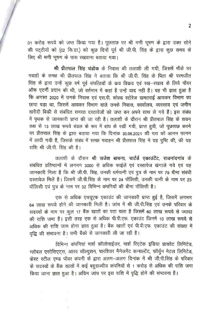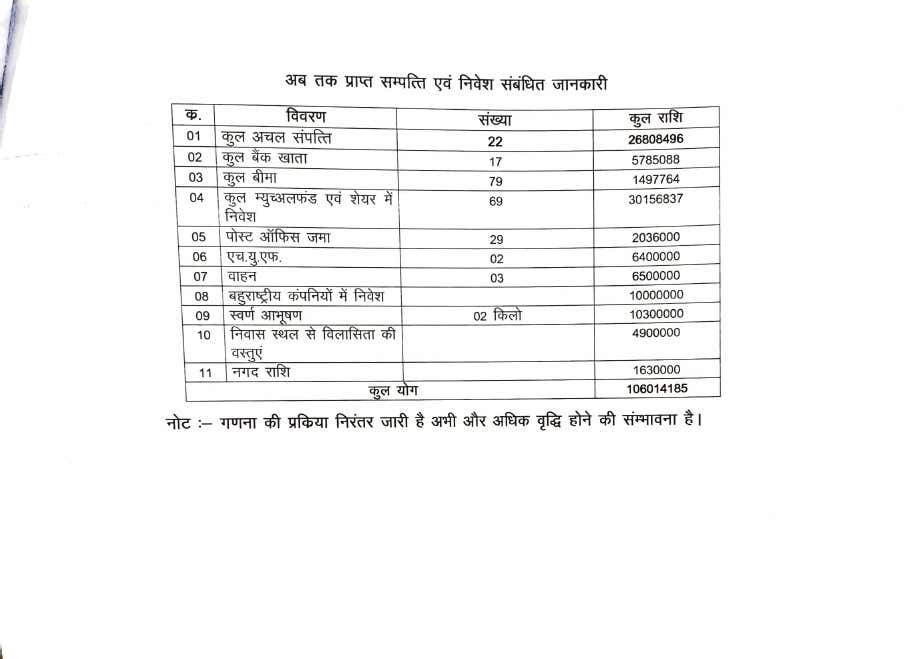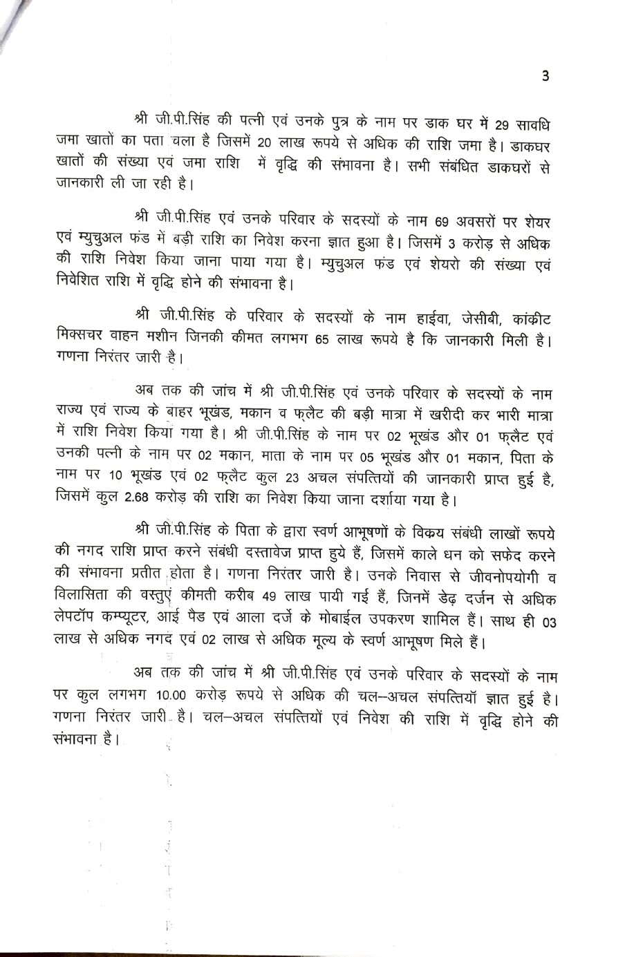 परिवार के सदस्यों के नाम हाईवा, जेसीबी और कंक्रीट मिक्सचर मशीन भी मिली है। इसके अलावा जमीन में भी बड़ी मात्रा में निवेश के कागजात मिले हैं। जिसमें जीपी सिंह के साथ ही उनकी पत्नी , मां और पिताजी के नाम पर भी कई जमीन और घर की जानकारी मिली है। अभी भी संपत्तियों की जांच की जा रही है। ऐसे में आगे ये आंकड़ा और भी बढ़ सकता है।