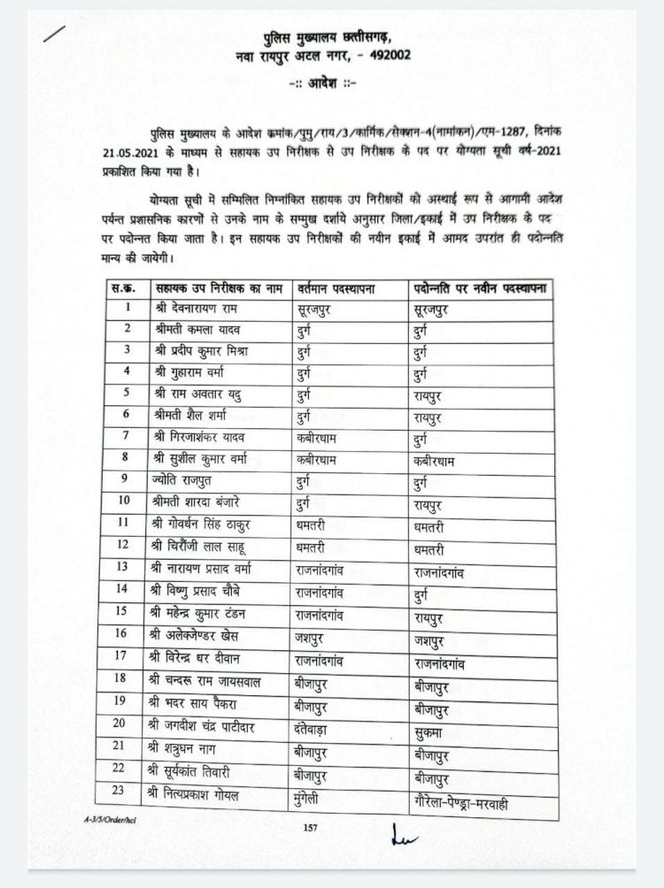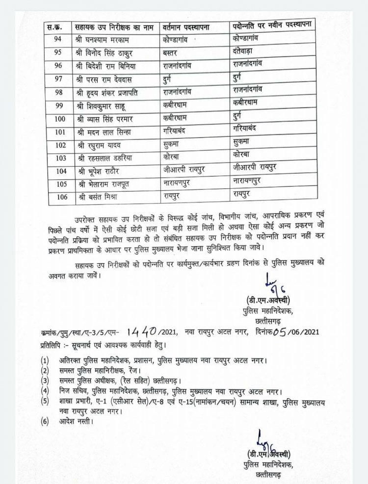 पुलिस मुख्यालय द्वारा जारी हुये प्रमोशन आदेश से 106 पुलिसकर्मियों के परिवारों में खुशियां आई है। डीजीपी डीएम अवस्थी के निर्देश पर आज पुलिस मुख्यालय से एएसआई से एसआई पद के लिये पदोन्नति सूची जारी कर दी गई। प्रदेश की विभिन्न इकाईयों में पदस्थ 106 एएसआई को पदोन्नत कर एसआई बनाया गया है।