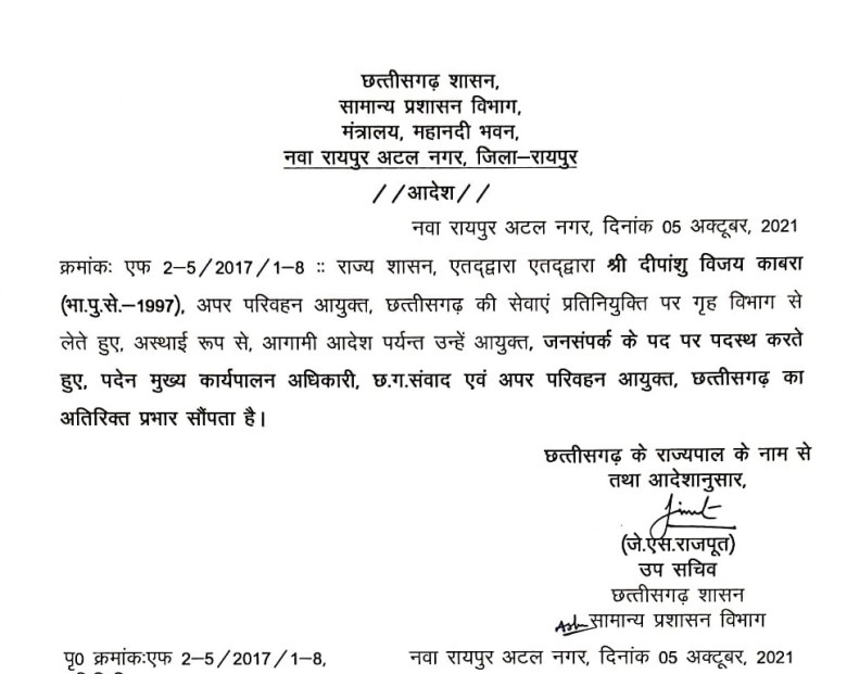 छत्तीसगढ़ में पहली बार जनसंपर्क में किसी आईपीएस अधिकारी को बड़ी जिम्मेदारी मिली है। 1997 बैच के आईपीएस अधिकारी आईजी दीपांशु काबरा को जनसंपर्क आयुक्त नियुक्त किया गया है। आईपीएस काबरा अभी वर्तमान में परिवहन विभाग अपर आयुक्त की जिम्मेदारी संभाल रहे थे। अब उन्हें सीईओ संवाद का भी अतिरिक्त प्रभार मिला है,