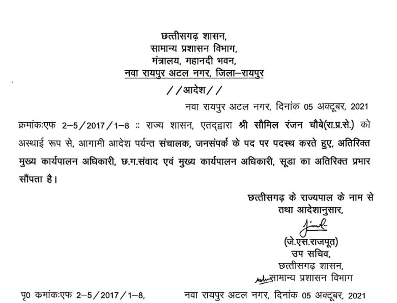 वहीं सौमिल रंजन चौबे (राप्रसे) को अस्थाई रूप से संचालक जनसंपर्क का पद पर पदस्थ करते हुए अतितिक्त मुख्य कार्यपालन अधिकारी छग संवाद तथा सीईओ सूडा का अतिरिक्त प्रभार सौंपा गया है। उक्ताशय के आदेश सामान्य प्रशासन विभाग उपसचिव जेएस राजपूत ने जारी कर दिए हैं।
