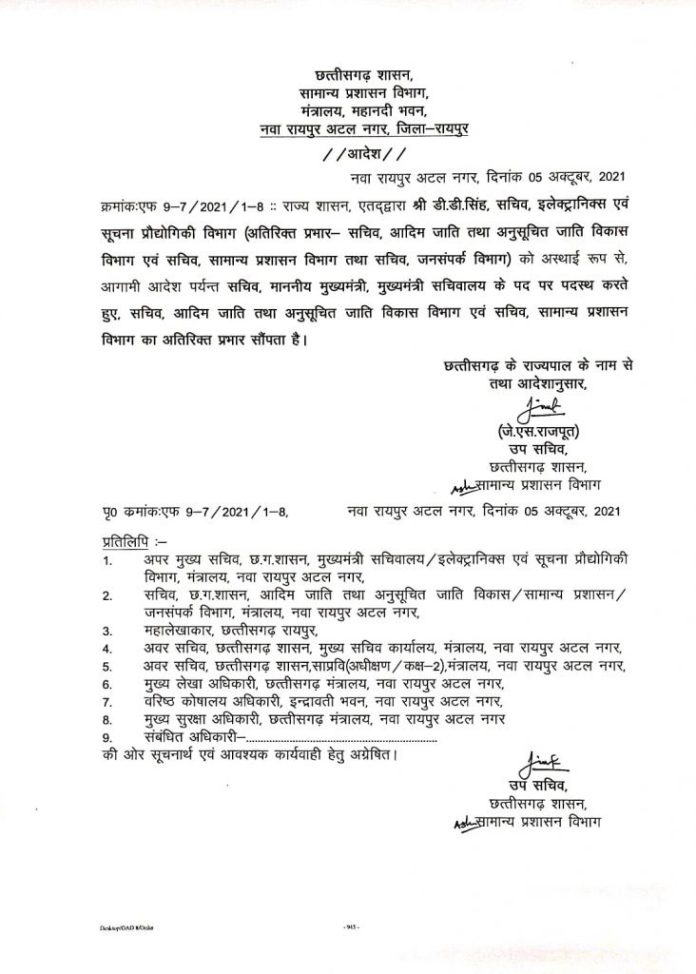 तीन आईएएस अधिकारियों की नई पदास्थना के आदेश निकालने के बाद राज्य सरकार ने एक और प्रशासनिक पोस्टिंग का आदेश जारी किया है। इसके तहत राज्य सरकार ने पूर्व आईएएस डीडी सिंह को रिटायरमेंट के बाद बड़ी जिम्मेदारी सौंपी गई है।सिंह को सीएम सचिवालय में एंट्री मिल गई है। राज्य गठन के बाद सीएम सचिवालय में पहली बार बतौर सीएम सचिव के तौर पर आदिवासी चेहरे की नियुक्ति हुई है। इसके अलावा उन्हें सामान्य प्रशासन विभाग का अतिरिक्त प्रभार सौंपा गया है।