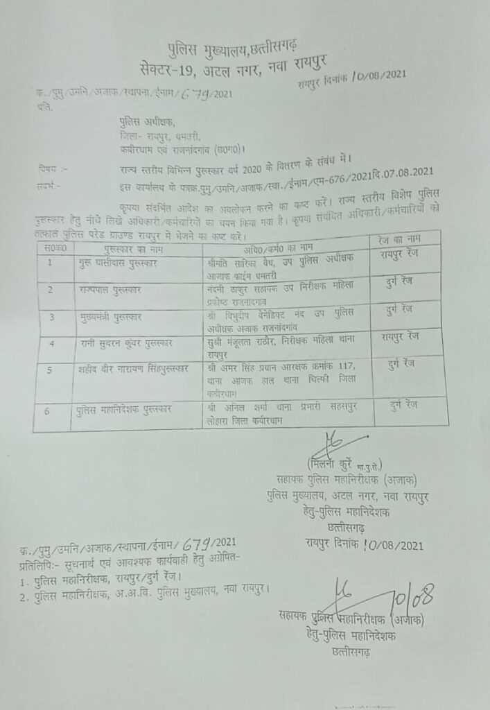🌐 राज्यपाल और मुख्यमंत्री भूपेश बघेल स्वतंत्रता दिवस समारोह पर राज्य के 6 पुलिसकर्मियों को सम्मानित करेंगे।🌐