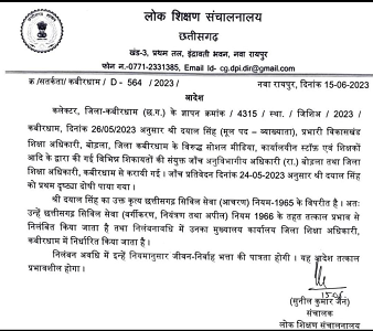 बोड़ला के प्रभारी BEO दयाल सिंह को राज्य सरकार ने सस्पेंड कर दिया है। बीईओ का मूल पद व्याख्याता का है। पिछले दिनों विकासखंड शिक्षा कार्यालय में महिला स्टाफ से बदसलूकी के मामले में बोड़ला बीईओ दयाल सिंह के खिलाफ थाने में एफआईआर हुई थी। मामले में थाना तलब कर बीईओ श्री सिंह की गिरफ्तारी हुई, हालांकि कुछ देर बाद उन्हें रिहा भी कर दिया गया था। इस मामले में खबर प्रकाशित होने पर बीईओ ने पत्रकारों को ही धमकी दे दी थी।मामले में विभागीय स्तर पर शिकायत के बाद जांच करायी गयी थी, जिसके बाद डीपीआई ने प्रभारी बीईओ दयाल सिंह को सस्पेंड कर दिया है। दयाल सिंह की जांच एसडीएम बोड़ला और डीईओ कबीरधाम की तरफ से करायी गयी थी, जिसमें बीईओ को दोषी माना गया था। सस्पेंशन पीरियड में बीईओ को डीईओ कार्यालय कबीरधाम में पोस्टेड किया गयाहै।