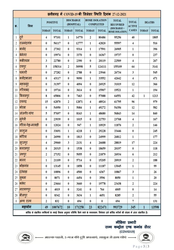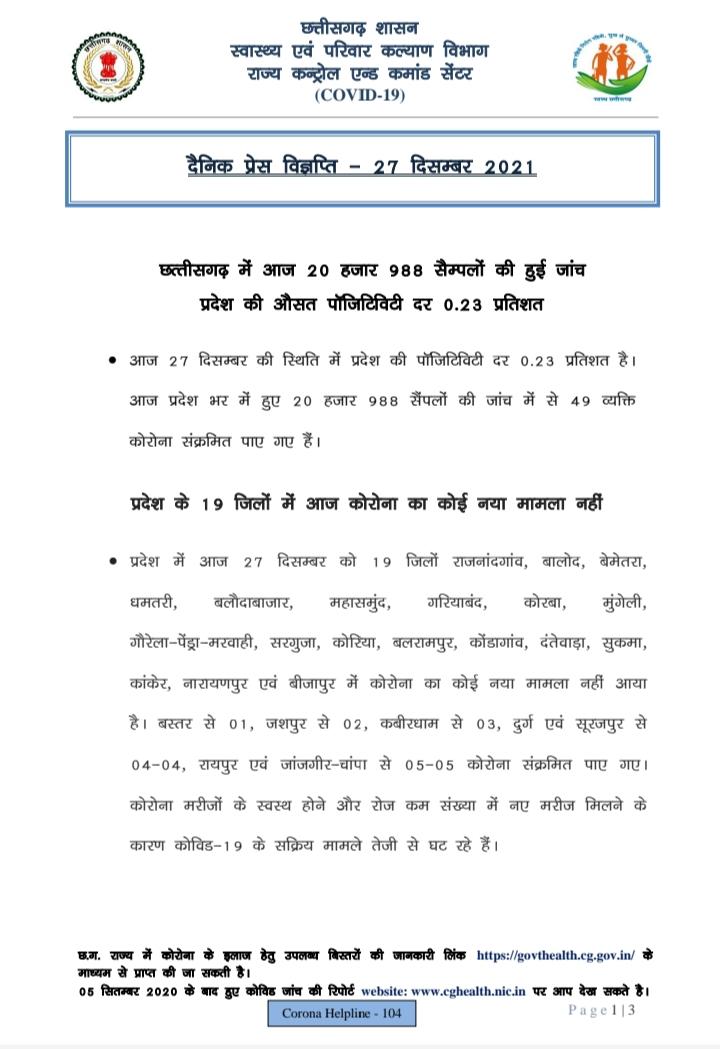कोरोना छत्तीसगढ़ अपडेट : 27/Dec/2021