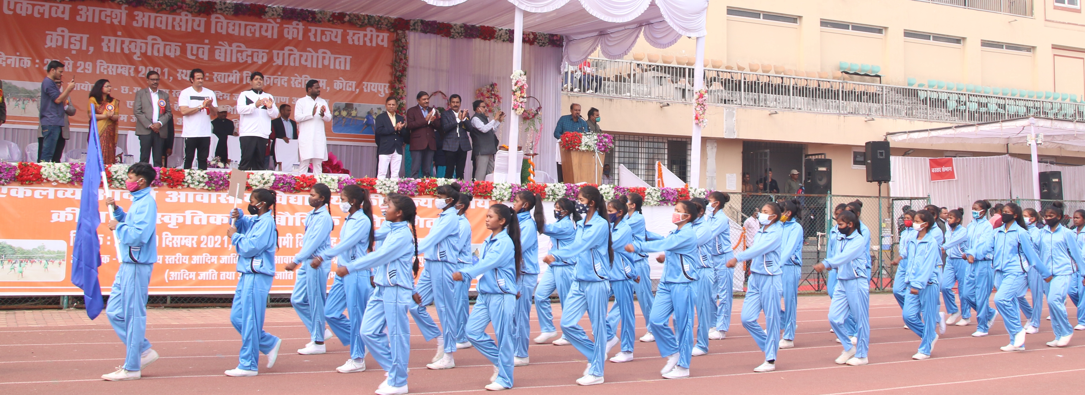 संसदीय सचिव श्री विकास उपाध्याय ने आज राजधानी के स्वामी विवेकानंद स्टेडियम कोटा में एकलव्य आदर्श आवासीय विद्यालयों की तीन दिवसीय राज्य स्तरीय क्रीड़ा, सांस्कृतिक एवं बौद्धिक प्रतियोगिता का शुभारंभ किया। इस प्रतियोगिता में 1300 से अधिक प्रतिभागी हिस्सा ले रहे हैं। इस क्रीड़ा प्रतियोगिता में 16 प्रकार की खेल विधाएं होंगी। प्रतियोगिता 14 वर्ष और 19 वर्ष से अधिक आयु वर्ग में बालक और बालिकाओं के लिए आयोजित की गई है। श्री विकास उपाध्याय ने मां सरस्वती के चित्र पर माल्यार्पण और दीप प्रज्जवलन के बाद ध्वजारोहण किया। उन्होंने प्रतियोगिता के शुभारंभ की विधिवत घोषणा की। इस अवसर पर प्रतिभागियों ने आकर्षक मार्च पास्ट किया। शभारंभ कार्यक्रम की अध्यक्षता महापौर श्री एजाज ढेबर ने की। इस अवसर पर अनुसूचित जाति एवं अनुसूचित जनजाति विभाग के सचिव श्री डी.डी. सिंह, आयुक्त श्रीमती शम्मी आबिदी, वार्ड पार्षद श्री प्रकाश जगत सहित शिक्षक, प्रशिक्षक, कोच और खिलाड़ी उपस्थित थे।