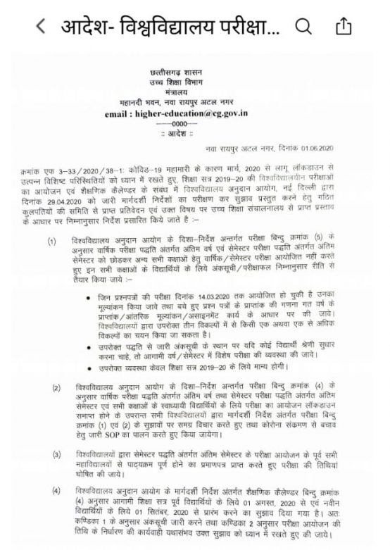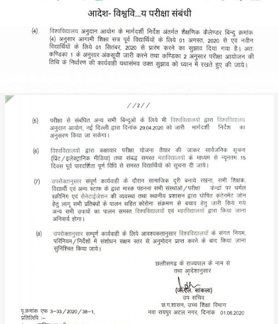 विश्वविद्यायों के फायनल ईयर के छात्रों को परीक्षा देनी होगी। बाकी फर्स्ट एवं सेकेंड ईयर के छात्रों को परीक्षा में बैठने की जरूरत नहीं होगी।कुलपतियों की कमेटी की रिपोर्ट के बाद उच्च शिक्षा विभाग ने आज विवि परीक्षाओं के बारे में आदेश जारी कर दिया।इसके अनुसार फायनल ईयर के छात्रों एवं सेमेस्टर में फायनल के लिए लॉकडाउन के बाद एग्जाम लिए जाएंगे। बाकी फर्स्ट एवं सेकेंड ईयर के लिए जितने परीक्षा हो गई है। उसका मूल्यांकन किया जाएगा। और बचे पेपर के लिए तीन केटेगरी बनाए गए हैं। पिछली परीक्षा, आंतरिक मूल्यांकन या असाईनमेंट वर्क। सेमेस्टर फायनल की भी परीक्षा होगी।