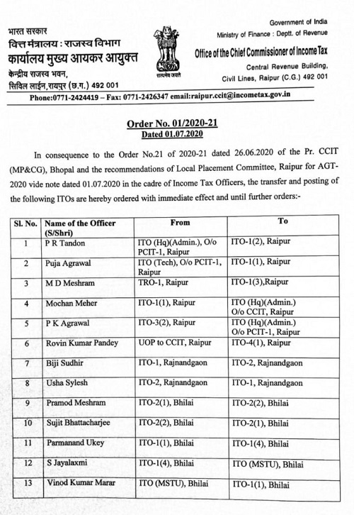 छत्तीसगढ़ प्रदेश : 02/Jul/2020 🌎प्रदेश मे रायपुर, भिलाई और बिलासपुर के आयकर अधिकारियों का तबादला लिस्ट जारी हुआ हैं |🌍