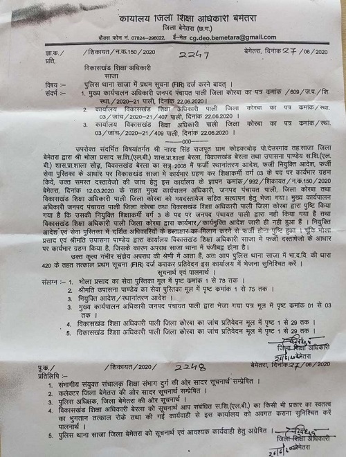 दो लोगों ने शिक्षाकर्मी की फर्जी नियुक्ति पत्र और फर्जी स्थानांतरण आदेश बनाकर प्रशासन की आंखों में ऐसे धूल झोंका कि 12 साल नौकरी कर ली, किसी को हवा नहीं लगी। अब जब शिकायत हुई, तो जांच भी हुई। जांच के बाद पता चला कि दोनों प्रशासन को चूना लगा रहे थे। इसमें से एक महिला है। दोनों के खिलाफ एफआईआर कराने की तैयारी की जा रही है। जानकारी मिली है कि यह मामला बेमेतरा जिले का है। सरकारी प्राइमरी स्कूल बेरला में पदस्थ दो शिक्षक भोला प्रसाद और सरकारी प्राइमरी स्कूल सोड़ में पदस्थ उपासना पांडे के संबंध में ऐसी ही जानकारी मिली है। दोनों ने कोरबा जिले के पाली जनपद पंचायत में अपनी नियुक्ति और वहां से बेमेतरा जिले में स्थानांतरण का आदेश दिखाकर यहां के अफसरों को बेवकूफ बना लिया।