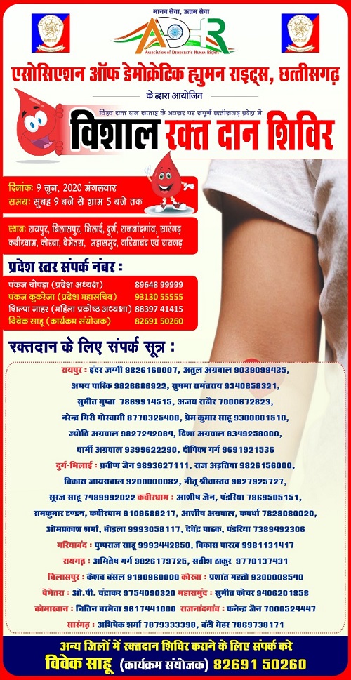 कोरोना संक्रमण के मद्देनजर मानवधिकार संस्था एसोसिएशन ऑफ डेमोक्रेटिक ह्यूमन राइट्स द्वारा छत्तीसगढ़ में 12 शहरों के18 ब्लड बैंकों में 09 जून को विशाल रक्तदान शिविर का आयोजन किया जायेगा