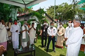 मुख्यमंत्री श्री भूपेश बघेल के द्वारा धार्मिक स्थलों में आज से फिजिकल और सोशल डिस्टेंसिंग के साथ पूजा अर्चना प्रारंभ किये जाने के निर्णय का स्वागत करते हुए आज उनके निवास स्थान पर रायपुर विधायक श्री विकास उपाध्याय के नेतृत्व में 31 ब्राम्हणगणों ने शंखनाद एवं मंत्रोच्चार के साथ उनका आभार व्यक्त कर अभिनंदन किया ।विधायक श्री विकास उपाध्याय ने छत्तीसगढ़ में धार्मिक स्थलों के खोले जाने का पूरा श्रेय मुख्यमंत्री श्री बघेल को देते हुए कहा कि उन्हीं के प्रयासों से यह शुभ कार्य सम्भव हो पाया है । ब्राम्हणगणों ने मुख्यमंत्री श्री बघेल का आभार व्यक्त करते हुए उनके नेतृत्व में राज्य सरकार द्वारा किये जा कार्यों की सराहना की । मुख्यमंत्री श्री बघेल ने ब्राम्हण गणों से कोरोना महामारी के बचाव के लिए मन्दिरों में मास्क एवम सेनेटाइजर के साथ ही फिजिकल डिस्टेंसिंग का अनिवार्य पालन करने को कहा है । उन्होंने कहा कि आप सुरक्षित रहेंगे तभी मन्दिर परिसर भी सुरक्षित होगा ।