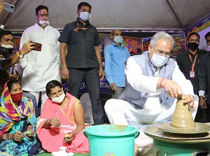मुख्यमंत्री ने स्व-सहायता समूहों की महिलाओं ने स्टॉल में रखे चॉक देखकर अपने आपको नहीं रोक पाए और स्वयं भी कुम्हार की तरह मिट्टी के कलात्मक सामग्री बनाने वाले कलाकार की तरह बनकर अपने हाथों से दीया बनाया। उन्होंने इस अवसर पर अधिकारियों को कुम्हारों को उनके व्यवसाय को बढ़ावा देने वाले सुविधाएं प्रदान करने के साथ-साथ उन्हें मिट्टी में लगने वाले रॉयल्टी टैक्स को नहीं लेने के निर्देश दिए।