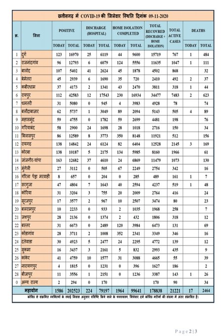 जिलेवार मरीजों की संख्या दुर्ग- 123,राजनांदगांव- 96,बालोद- 107,बेमेतरा- 45,कवर्धा- 37,रायपुर- 112,धमतरी- 31,बलौदाबाजार- 62,महासमुंद- 59,गरियाबंद- 58,बिलासपुर- 86,रायगढ़- 138,कोरबा- 138,जांजगीर- 163,मुंगेली- 27,गौरेला-पेंड्रा-मरवाही- 08,सरगुजा- 47,कोरिया- 31,सूरजपुर- 17,बलरामपुर- 10,जशपुर- 28,बस्तर- 31,कोंडागांव- 28,दंतेवाड़- 30,सुकमा- 16,कांकेर- 41,नारायणपुर- 04,बीजापुर- 11,अन्य राज्य- 02 मरीज शामिल हैं।