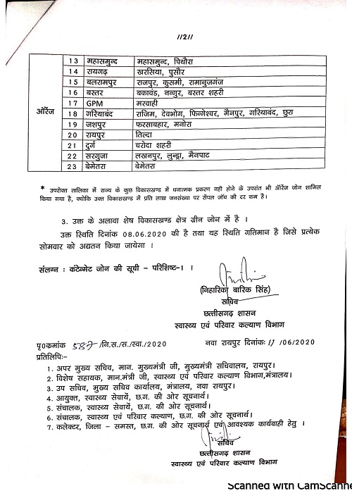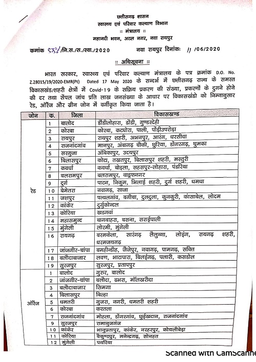 राज्य शासन के स्वास्थ्य विभाग ने रेड, ऑरेंज और ग्रीन जोन वाले विकासखंडों की नई सूची अधिसूचित की है। केन्द्रीय स्वास्थ्य एवं परिवार कल्याण मंत्रालय के दिशा-निर्देशों के मुताबिक प्रदेश के सभी विकासखंडों और शहरी क्षेत्रों में कोविड-19 के सक्रिय मामलों की संख्या, इनके दोगुने होने की दर तथा प्रति एक लाख जनसंख्या पर सैंपल जांच की ताजा स्थिति के आधार पर उन्हें रेड, ऑरेंज और ग्रीन जोन में पुनः वर्गीकृत किया गया है।
