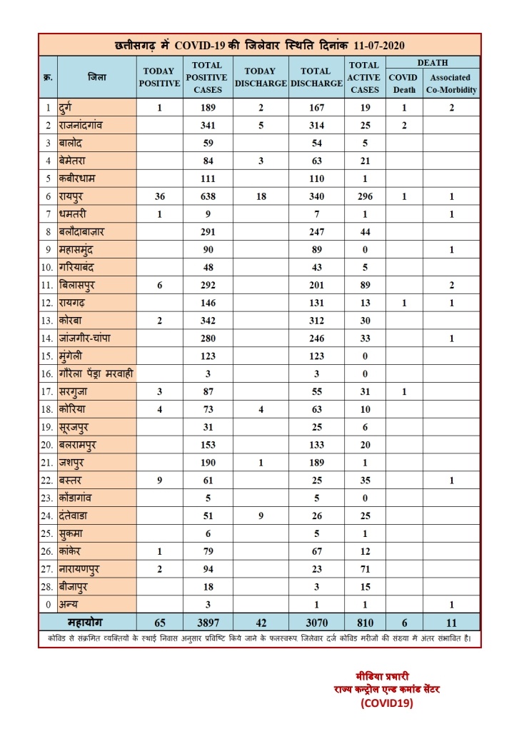 कुल पॉजिटिव मरीज़ों की संख्या 3897 है व एक्टिव मरीज़ों की संख्या 810 है।#ChhattisgarhFightsCorona@TS_SinghDeo @ChhattisgarhCMO @Niharikaspeaks pic.twitter.com/SdZqnbMdgE