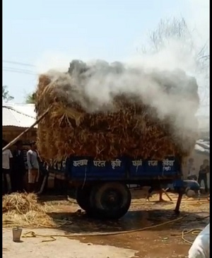पिथौरा :::धान की गट्ठर ट्रेक्टर से लाद कर कोठार लेते समय बिजली तार छू जाने से धान में अचानक लगी आग।राजा सैवैया गाँव की अभी दोपहर का मामला। ग्रामीणजन उठते आग की लपट बुझाने में जुटे।