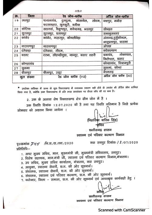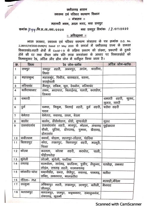 राज्य शासन के स्वास्थ्य विभाग ने रेड, ऑरेंज और ग्रीन जोन वाले विकासखंडों की नई सूची अधिसूचित की है। केन्द्रीय स्वास्थ्य एवं परिवार कल्याण मंत्रालय के दिशा-निर्देशों के मुताबिक प्रदेश के सभी विकासखंडों और शहरी क्षेत्रों में कोविड-19 के सक्रिय मामलों की संख्या, इनके दोगुने होने की दर तथा प्रति एक लाख जनसंख्या पर सैंपल जांच की ताजा स्थिति के आधार पर उन्हें रेड, ऑरेंज और ग्रीन जोन में पुनः वर्गीकृत किया गया है। स्वास्थ्य विभाग द्वारा 12 जुलाई की स्थिति के आधार पर यह वर्गीकरण किया गया है। इसे हर सोमवार को अद्यतन किया जाता है। रेड, ऑरेंज और ग्रीन जोन घोषित विकासखंड इस प्रकार हैं -