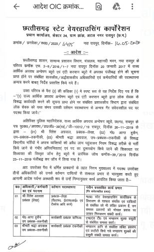 छत्तीसगढ़ स्टेट वेयर हाउसिंग कार्पोरेशन में नियम विरुद्ध भर्ती किए जाने के मामले में की गई शिकायत पर छत्तीसगढ़ स्टेट वेयर हाउसिंग कार्पोरेशन के प्रबंध संचालक ने तत्कालीन प्रबंधक लेखा सीएम रितेश अग्रवाल, मो आगा हुसैन तत्कालीन उप प्रबंधक तकनीकी और तत्कालीन प्रबंधक उप तकनीकी श्रद्धा अग्रवाल को तत्काल प्रभाव से उनके प्रभार से हटा दिया है। उनके स्थान पर अन्य को प्रभार सौंपा गया है। जबकि शिकायत में शामिल एक अन्य तत्कालीन अधिकारी को क्लीन चिट दे दी गई है।