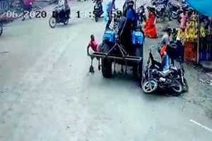 नवागढ़ के राजीव गांधी चौक पर बुधवार को अनियंत्रित ट्रैक्टर ने 3 बाइक सवारों को रौंद दिया. हादसे में एक शख्स की मौत हो गई है, वहीं उसके पुत्र को गंभीर हालत में अस्पताल में भर्ती कराया गया है. हादसे के बाद ट्रैक्टर चालक मौके से फरार हो गया है. इस हादसे में 2 बाइक सवार बाल-बाल बचा है.पुलिस ने ट्रैक्टर मालिक सुखदेव मरकाम को हिरासत में लिया है. वहीं हादसे के बाद से ट्रैक्टर चालक सुनील ध्रुव फरार बताया जा रहा है. ट्रैक्टर का मालिक और चालक नवागढ़ का ही रहने वाला है. यह पूरा हादसा सड़क किनारे लगे CCTV में कैद हो गया है.