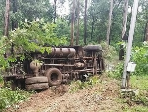 सोमवार की सुबह बीजापुर हाइवे पर एक हादसा हो गया। रायपुर की ओर से आ रहा ट्रक अचानक अनियंत्रित होकर पलट गया। गैस सिलेंडर से भरे इस ट्रक के पलटने से कुछ सिलेंडर सड़क पर आ गिरे। घटना की सूचना मिलते ही मौके पर पुलिस रवाना हुई। भीड़ को हटाकर अब ट्रक को हटाने की तैयारी की जा रही है। इस हादसे में दो पुलिसकर्मियों को चोटें आई हैं। ड्राइवर राजीव ने बताया कि ब्रेक न लगने की वजह से ट्रक अनियंत्रित होकर पलट गया ड्राइवर मूलत: वो बिहार का रहने वाला है। रायपुर से सिलेंडर लेकर बीजापुर डिलिवर करने आया था। वह अपने साथ एक किशोर को भी लेकर निकला था जो कि ड्राइवर का रिश्तेदार है। रास्ते में लिफ्ट लेकर डीआरजी के जवान राजू तेलाम और इसका एक साथ जवान भी इसी ट्रक में चढ़े। बीजापुर नाका, कोतपाल के पास ट्रक पलटने की वजह से दोनों को चोटें आई हैं, इन्हें बीजापुर जिला अस्पताल भेजा गया है। ड्राइवर और उसके रिश्तेदार को कोई चोट नहीं आई। घटना को लेकर पुलिस भी पूछताछ कर रही है।