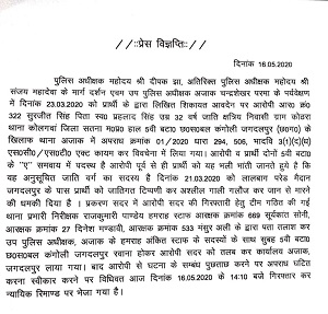 जातिगत टिप्पणी और अश्लील गाली-गलौज करने के मामले में पुलिस ने 5 वीं बटालियन के "ए" समवाय में पदस्थ सुरजीत सिंह पिता स्व. प्रहलाद सिंह उम्र 32 वर्ष को गिरफ्तार किया है दरअसल आरोपी और प्रार्थी दोनों ही 5 वी बटालियन के "ए" समवाय में पदस्थ है दिनांक 21 मार्च को लालबाग परेड मैदान में आरोपी सुरजीत सिंह ने प्रार्थी को जातिगत टिप्पणी करते हुए अशलील गाली दी जिसकी शिकायत प्रार्थी ने पुलिस में की थी जिसपर एक्शन लेते हुए पुलिस छ.स.बल कंगोली जगदलपुर पहुंची और आरोपी को हिरासत में लेके उसे अजाक, जगदलपुर लाया और इस मामले में पूछताछ की जिसपर आरोपी ने अपना जुर्म कबूला जिसके बाद पुलिस ने उस पर कार्रवाई करते हुए उसे गिरफ्तार कर न्यायिक रिमांड पर भेज दिया