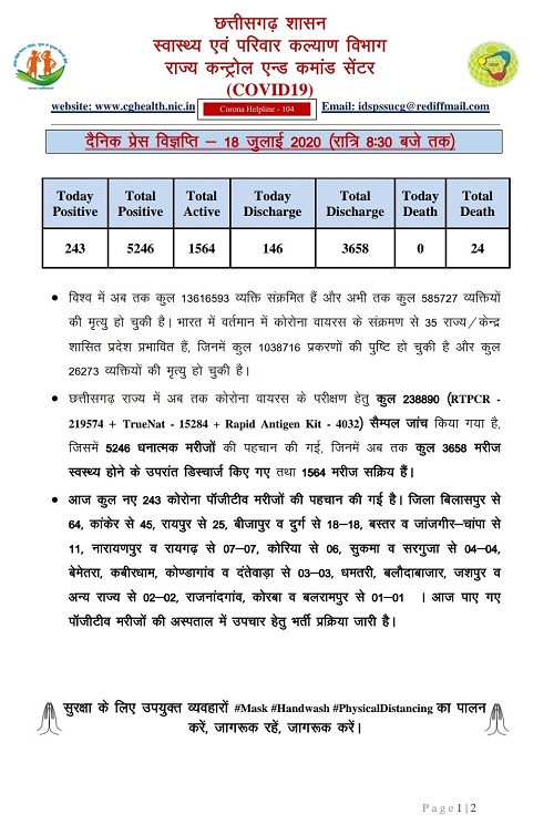 detail news only from Chhattishgarh ,dated: १८ जुलाई २०२०