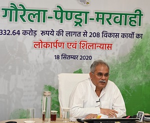 मुख्यमंत्री श्री भूपेश बघेल आज अपने निवास कार्यालय से वीड़ियो कॉन्फ्रेंसिंग के जरिए गौरेला-पेण्ड्रा-मरवाही जिले को 332.64 करोड़ के विकास कार्यों की सौगात देने के बाद कार्यक्रम को मुख्य अतिथि की आसंदी से संबोधित कर रहे थे। इस अवसर पर कार्यक्रम की अध्यक्षता विधानसभा अध्यक्ष डॉ. चरण दास महंत ने की। कार्यक्रम में सभी मंत्रीगण, लोकसभा सांसद श्रीमती ज्योत्सना महंत एवं अन्य जनप्रतिनिधि कार्यक्रम में वीड़ियो कॉन्फ्रेंसिंग के माध्यम से शामिल हुए।