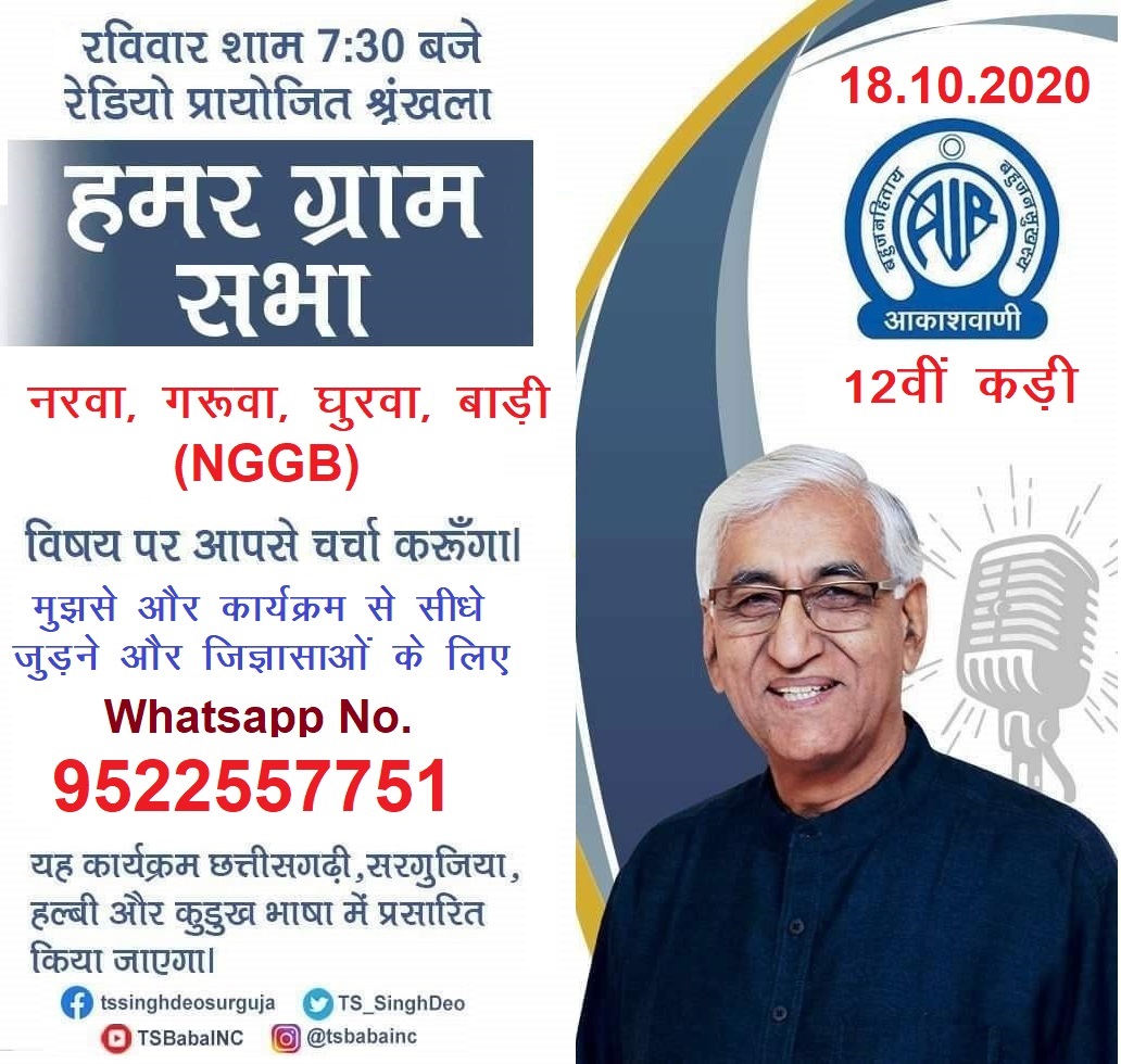 पंचायत एवं ग्रामीण विकास मंत्री श्री सिंहदेव नरवा, गरवा, घुरवा, बाड़ी योजना के बारे में रेडियो पर देंगे जानकारी ,आकाशवाणी रायपुर से ‘हमर ग्रामसभा’ का प्रसारण 18 अक्टूबर को