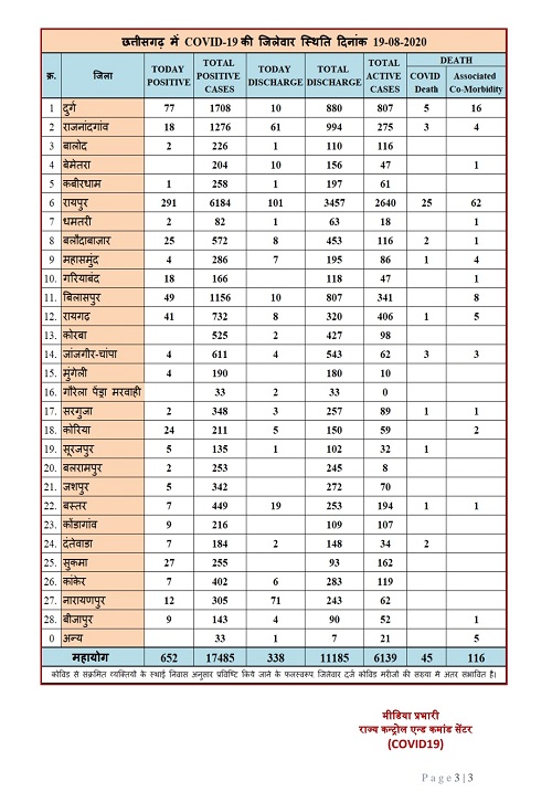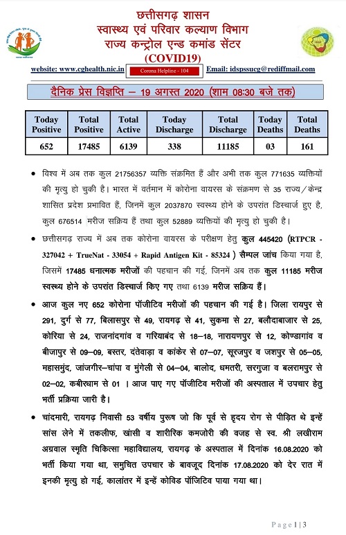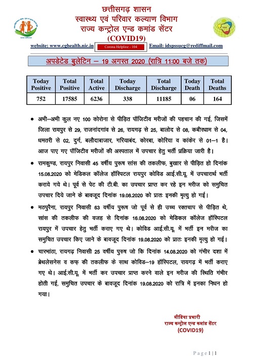 detail news only from Chhattishgarh ,dated: 19 अगस्त २०२०