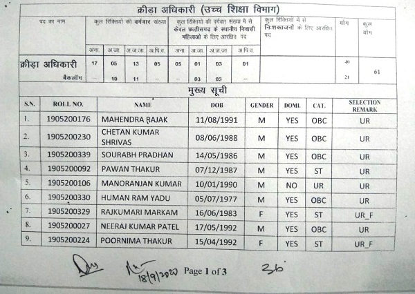 छत्तीसगढ़ लोक सेवा आयोंग द्वारा उच्च शिक्षा विभाग के अंतर्गत क्रीड़ा अधिकारी के कुल 61 पदों के विरूद्ध 55 पदों पर भर्ती के लिए चयन सूची जारी की गई है। लोक सेवा आयोग से प्राप्त जानकारी के अनुसार उच्च शिक्षा विभाग के तहत क्रीड़ा अधिकारी की 61 पदों पर भर्ती के लिए 26 नवम्बर 2019 को ऑनलाइन परीक्षा का आयोजन किया गया था । जिसमें 184 अभ्यर्थी शामिल हुए ।