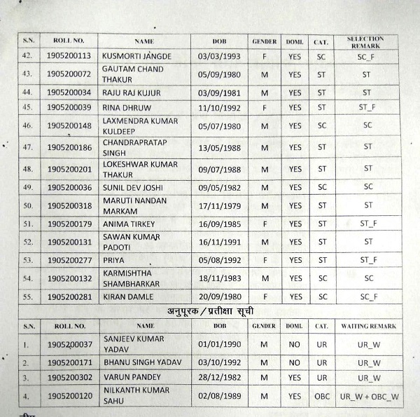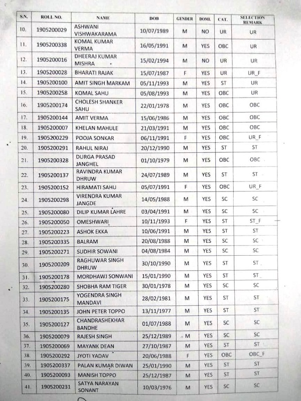 ऑनलाईन परीक्षा में विज्ञापित पदों का तीन गुना अर्थात 183 अभ्यर्थियों को वर्गवार, उपवर्गवार साक्षात्कार के लिए चिन्हांकित किया जाना था, किन्तु पात्र अभ्यर्थियों की अनुपलब्धता के कारण 98 अभ्यर्थियों का साक्षात्कार लिया गया। साक्षात्कार 15 सितम्बर से 18 सितम्बर तक लिया गया। उपरोक्त पदों से संबंधित चयन सूची, अनुपूरक सूची आयोग के वेबसाइट www.psc.cg.gov.in पर जारी कर दिया गया है। चयन, अनुपूरक सूची निम्नानुसार है-