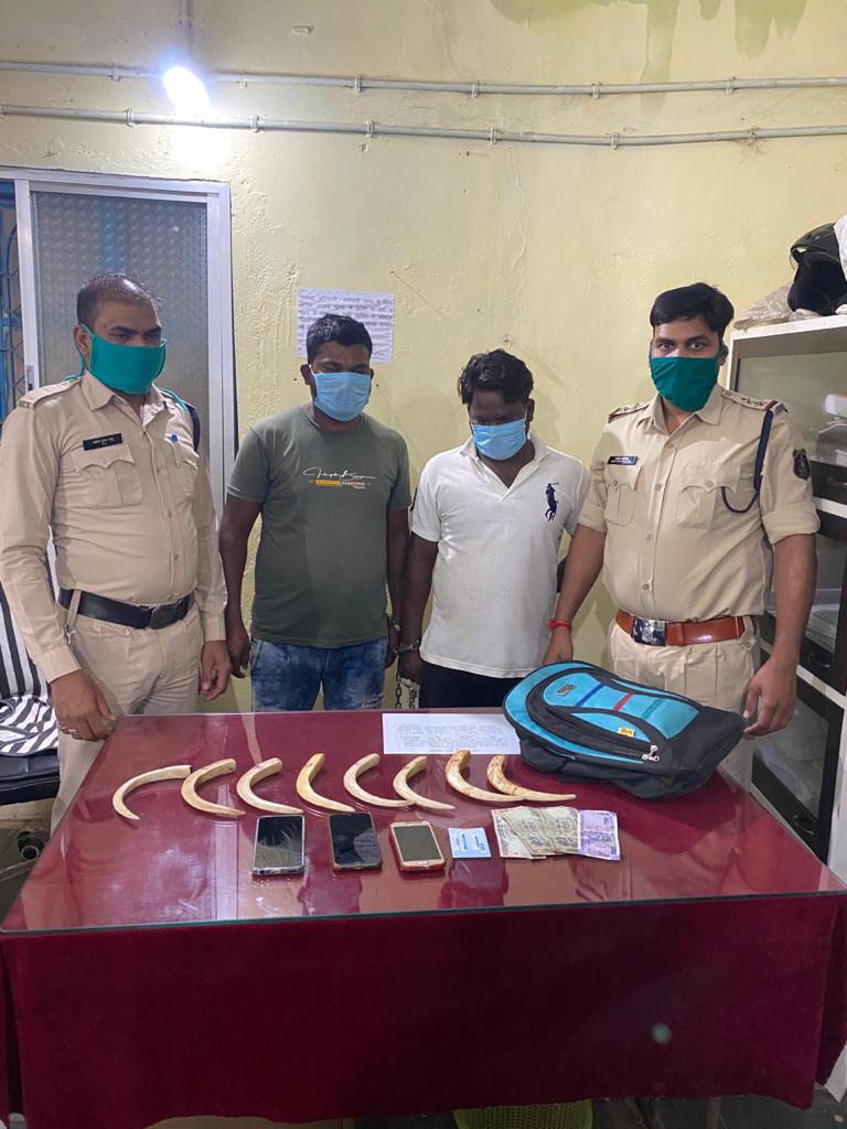 श्रीमान पुलिस अधीक्षक महोदय महासमुंद श्री प्रफुल्ल कुमार ठाकुर के आदेशानुसार एवं अतिरिक्त पुलिस अधीक्षक महोदया श्रीमति मेघा टेमभुलकर के निर्देशानुसार एवं श्री विकास पाटले अनुविभागीय अधिकारी पुलिस सरायपाली के मार्गदर्शन में क्षेत्र में लगातार अवैध कार्यों पर अकुंश लगाने का सतत प्रयास किया जा रहा है एवं कार्यवाही की जा रही है ,आज २१ जुलाई को मुखबीर के जरिये सूचना प्राप्त हुआ कि मोटर सायकल क्रमांक CG 11 CF 6378 बजाज डिस्कवर में दो व्यक्ति सवार होकर नीले काले रंग के बेग में जंगली सुअर का दांत(खिरसा) रखकर सारंगढ से जयस्तंभ चौक होते हुये कुटेला चौक की ओर आ रहे है तथा जंगली सुअर का दांत(खिरसा) को बेचने के लिये ग्राहक तलाश कर रहे है कि सूचना पर तस्दीक हेतु कुटेला चौक सरायपाली पहुंचकर थोडी देर इंतजार किये जहां मुखबीर के बताये हुलिये की वाहन एवं दो व्यक्ति आते देखकर हाथ दिखाकर रोका गया जिनसे नाम पता पूछताछ करने पर उन्होंने अपना नाम अजय टण्डन पिता रथराम टण्डन जाति सतनामी उम्र 28 साल साकिन ठठारी थाना बाराद्वार जिला जांजगीर-चांपा और मनोज बरेठ पिता रामलाल बरेठ जाति धोबी उम्र 30 वर्ष साकिन लउसरा थाना बाराद्वार जिला जांजगीर- चांपा का रहने वाला बताया एवं बैग में रखे सामान एवं वाहन CG 11 CF 6378 के संबंध में पूछताछ करने पर हीला हवाला आना कानी किये जाने पर उक्त दोनो व्यक्तियों एवं उनके वाहन की एवं उनके पास रखे काले नीले रंग की बैग की तलाशी ली गयी,जिसमे बैग के अंदर 08 नग जंगली सुअर का दांत(खिरसा) जैसा वस्तु एक एटीएम, नगदी रकम 400 रूपये, 03 नग मोबाइल, एक नग मोटर सायकल मिला। संदेहीयों से उक्त वस्तु रखने के संबंध में वैध दस्तावेज प्रस्तुत करने हेतु नोटिस देने पर जबाब में उन्होने कोई वैध दस्तावेज नहीं होना बताया .