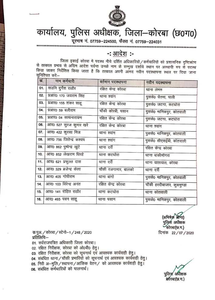 कोरबा : 22/Jul/2020 🌎जिला पुलिस महकमे में फेरबदल एक ASI, 4 प्रधान आरक्षक व 11 आरक्षकों का तबादला🌍