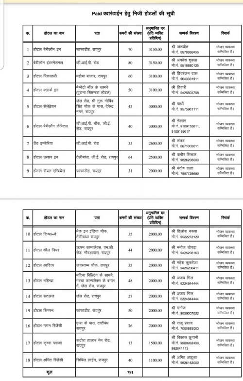 राज्य सरकार ने आज राजधानी के होटलों को खोलने की अनुमति दे दी है. शासन ने इन होटलों को पेड क्वारंटाइन सेंटर बनाया है. होटलों में विदेश या दूसरे राज्यों से आने व्यक्तियों को ठहराया जाएगा. इसके लिए दर निर्धारित कर दी गई है. इसके साथ ही विदेश से लौट रहे छत्तीसगढ़ के निवासी जो घरेलू वहान या सड़क मार्ग से राज्य में पहुंच रहे हैं, उनको इन नियमों का पालन किया जाना अनिवार्य किया है