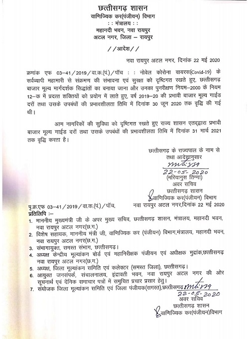 नोबेल कोरोना वायरस कोविड-19 सर्वव्यापी महामारी को दृष्टिगत रखते हुए, मुख्यमंत्री भूपेश बघेल के नेतृत्व में छत्तीसगढ़ सरकार द्वारा आम नागरिकों की सुविधा को देखते हुए जमीनों की खरीदी-बिक्री के लिए वर्ष 2019-20 में तय की गयी शासकीय गाइडलाईन की दरें जिन्हें 30 जून 2020 तक के लिए लागू किया गया था अब उन्हें शेष वित्तीय वर्ष के लिए लागू कर दिया गया है। अब संशोधित समय सीमा के तहत राज्य सरकार द्वारा प्रभावी बाजार मूल्य गाईड दरों और उसके उपबंधों की प्रभावशीलता तिथि में 31 मार्च 2021 तक वृद्धि की गई है। राज्य शासन के वाणिज्य कर (पंजीयन) विभाग द्वारा 22 मई को इस संबंध में मंत्रालय से आदेश जारी कर दिया गया है। इस सम्बंध में राजस्व आपदा प्रबंधन एवं वाणिज्य कर (पंजीयन) मंत्री जयसिंह अग्रवाल ने बताया कि मुख्यमंत्री भूपेश बघेल के नेतृत्व में नागरिकों की सुविधा के लिए शासकीय दरों और बाज़ार मूल्य में भिन्नता समाप्त करने हेतु प्रदेश सरकार ने पिछले वर्ष भूमि खरीदी-बिक्री के शासकीय गाईड लाईन के दरों को 30% कम किया गया था। जिससे प्रदेश में बेहतर परिणाम आये और व्यापक पैमाने पर जमीनों की खरीदी बिक्री की गई और इससे प्रदेश के राजस्व में भी उल्लेखनीय वृद्धि हुई।