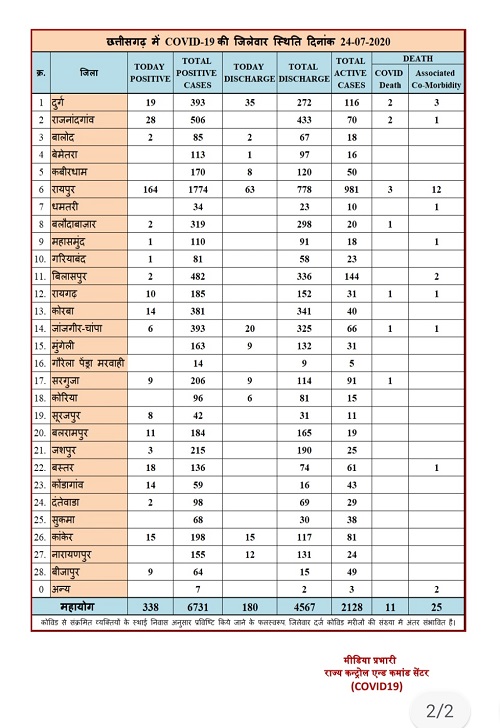 338 new #COVID19 positive cases have been reported today, taking the total number of cases to 6731 including 4567 recoveries and 2128 active cases.#ChhattisgarhFightsCorona@TS_SinghDeo @ChhattisgarhCMO @Niharikaspeaks pic.twitter.com/lMhEc9rQrW