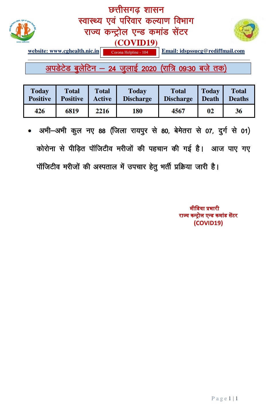 स्वास्थ्य विभाग द्वारा 8 ३० बजे के जारी बुलेटिंग में शुक्रवार को प्रदेश में रिकॉर्ड 338 नए मरीज सामने आए लेकिन उसके ठीक एक घंटे के बाद जारी बुलेटिंग में रात ९ ३० के अनुसार नए ८८ मरीज सामने आये जिससे मरीज की संख्या बढ़ कर प्रदेश में ४२६ हो गयी ,नये बुलेटिंग में से राजधानी रायपुर में ८०, बेमतरा में ७ और दुर्ग से एक शामिल हुए अब दोनों को मिला कर देखा जाए तो ९ ३० बजे तक प्रदेश में ४२६ नए मरीज सामने आये हैं ज्सिमे अकेले राजधानी से २४४ मरीज शामिल है इस तरह आज मिले ४२६ केस में रायपुर से २४४ राजनांदगांव से २८, दुर्ग से २०, बस्तर से 18, कांकेर से 15, कोंडागांव और कोरबा से 14-14, बलरामपुर से 11, रायगढ़ से 10, बीजापुर और सरगुजा से 9-9, सूरजपुर से 8, बेमतरा से ७ ,जांजगीर चांपा से 6, जशपुर से 3, बालोद बलौदाबाजार बिलासपुर और दंतेवाड़ा से 2-2, महासमुंद और गरियाबंद से 1-1 मरीज हो गए हैं