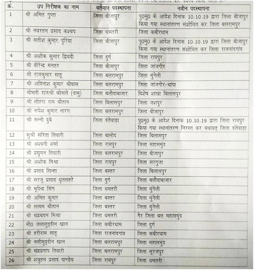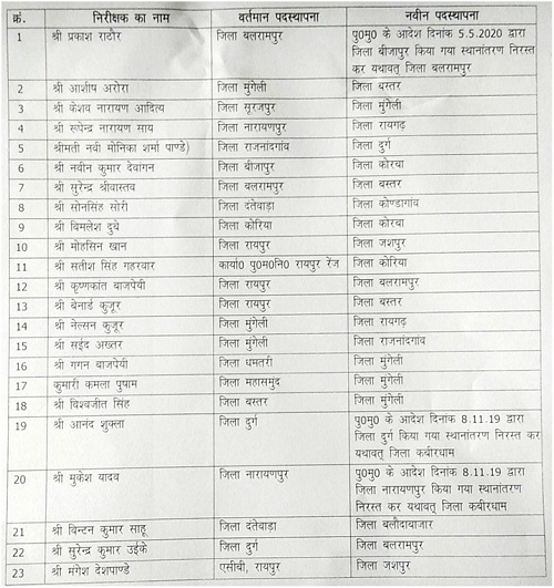राज्य पुलिस स्थापना बोर्ड के निर्णय अनुसार निरीक्षकों की प्रशासनिक कारणों से नवीन पदस्थापना की गई है। पुलिस मुख्यालय से इस संबंध में आदेश जारी कर दिया गया है। जो इस प्रकार है:-