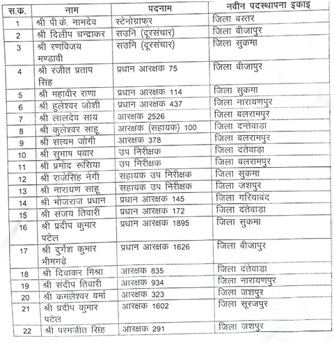 राज्य पुलिस स्थापना बोर्ड के निर्णय अनुसार उप निरीक्षकों की प्रशासनिक कारणों से नवीन पदस्थापना की गई है। पुलिस मुख्यालय से इस संबंध में आदेश जारी कर दिया गया है। जो इस प्रकार है:-