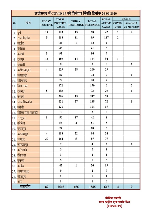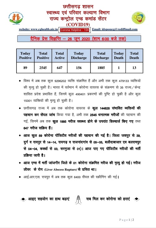 detail news only from Chhattishgarh ,dated: २६ जून २०२०