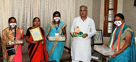 मुख्यमंत्री श्री भूपेश बघेल से आज यहां उनके निवास कार्यालय में धमतरी जिले के ग्राम छाती के मल्टीयूटीलिटी सेंटर बिहान की महिला सदस्यों ने सिहावा विधायक श्रीमती डॉ. लक्ष्मी ध्रुव के नेतृत्व में सौजन्य मुलाकात की। इस अवसर पर समूह की सदस्यों ने मुख्यमंत्री श्री बघेल को गोबर एवं बांस से बने उत्पाद भेंट किए और गोधन न्याय शुरू करने के लिए आभार व्यक्त किया। मुख्यमंत्री ने समूह द्वारा निर्मित उत्पादों की प्रशंसा की और उनके निरन्तर प्रगति के लिए बधाई एवं शुभकामनाएं दी। महिलाओं ने मुख्यमंत्री को छाती मल्टीयूटीलिटी सेंटर आने का न्यौता भी दिया।