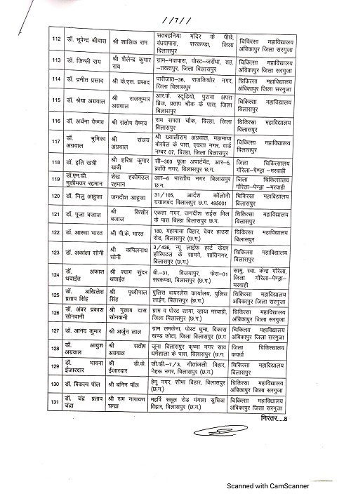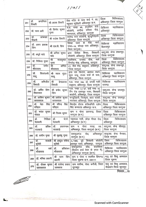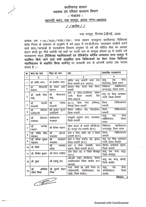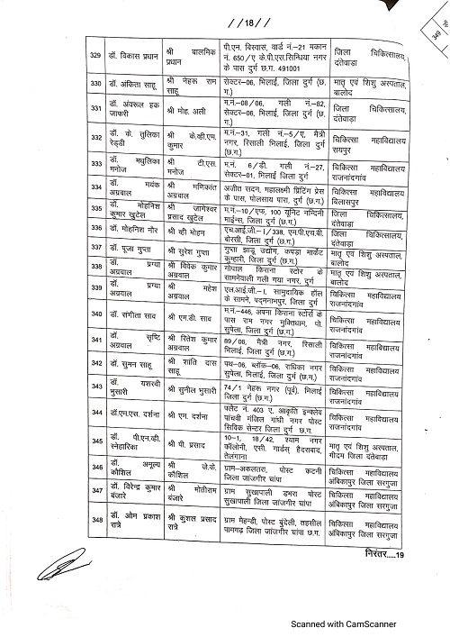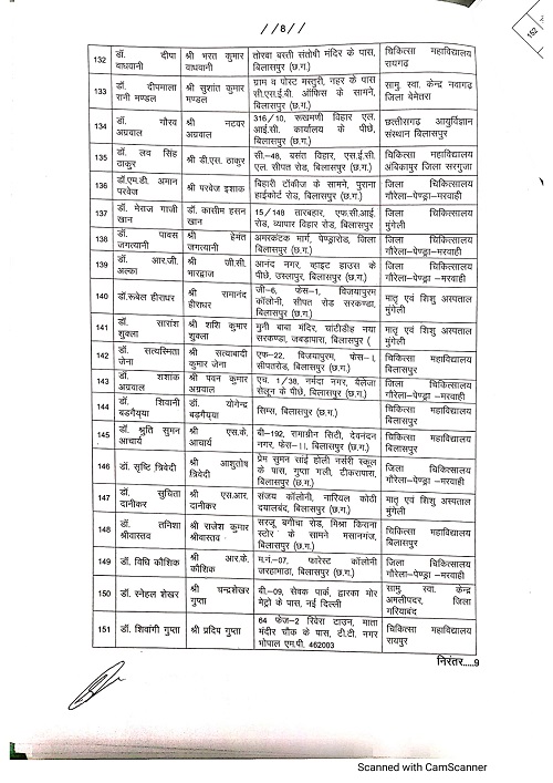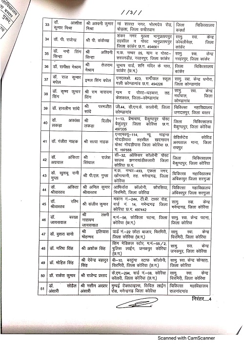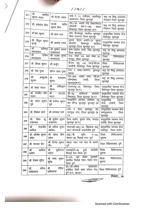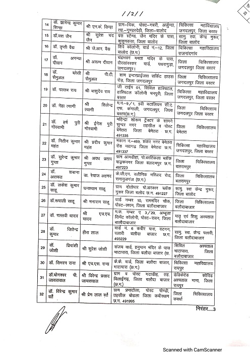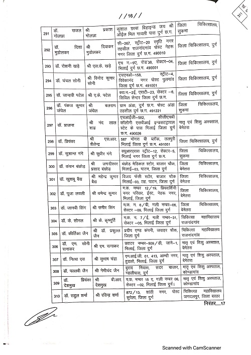 स्वास्थ्य एवं परिवार कल्याण विभाग द्वारा जारी डॉक्टरों की सूची एवं उनके पदस्थापना स्थल इस प्रकार हैं