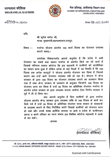 प्रदेश विधानसभा में नेता प्रतिपक्ष धरमलाल कौशिक ने कहा है कि प्रदेश में मनरेगा श्रमिकों की चिंता नहीं की जा रही है।नेता प्रतिपक्ष कौशिक ने लिखा मुख्यमंत्री बघेल को पत्र