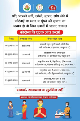 रायपुर : 28/Jul/2020 🌎29 - 31 जुलाई तक शहर के ज़ोनों में लगाया जा रहा है निशुल्क कोरोना जाँच शिविर🌍