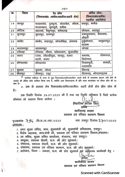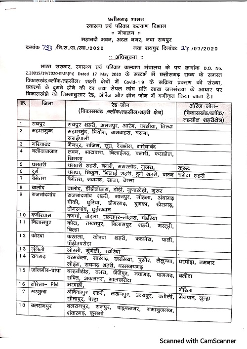 राज्य शासन के स्वास्थ्य विभाग ने रेड, ऑरेंज और ग्रीन जोन वाले विकासखंडों की नई सूची अधिसूचित की है। केन्द्रीय स्वास्थ्य एवं परिवार कल्याण मंत्रालय के दिशा-निर्देशों के मुताबिक प्रदेश के सभी विकासखंडों और शहरी क्षेत्रों में कोविड-19 के सक्रिय मामलों की संख्या, इनके दोगुने होने की दर तथा प्रति एक लाख जनसंख्या पर सैंपल जांच की ताजा स्थिति के आधार पर उन्हें रेड, ऑरेंज और ग्रीन जोन में पुनः वर्गीकृत किया गया है। स्वास्थ्य विभाग द्वारा 26 जुलाई की स्थिति के आधार पर यह वर्गीकरण किया गया है। इसे हर सोमवार को अद्यतन किया जाता है। रेड, ऑरेंज और ग्रीन जोन घोषित विकासखंड इस प्रकार हैं -