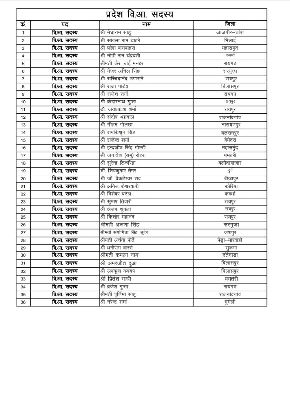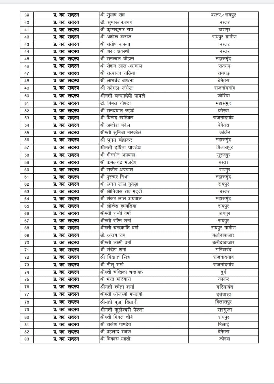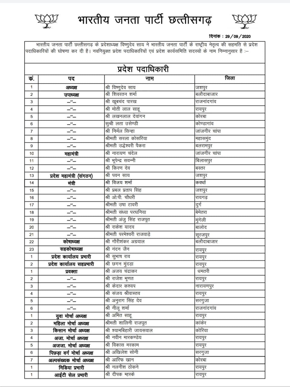 भारतीय जनता पार्टी छत्तीसगढ़ के प्रदेश अध्यक्ष विष्णुदेव साय ने बीजेपी के राष्ट्रीय नेतृत्व की सहमति से प्रदेश पदाधिकारियों की घोषणा की है.जिसमें नवनियुक्त प्रदेश पदाधिकारियों और प्रदेश कार्यसमिति सदस्यों के नाम शामिल है.
