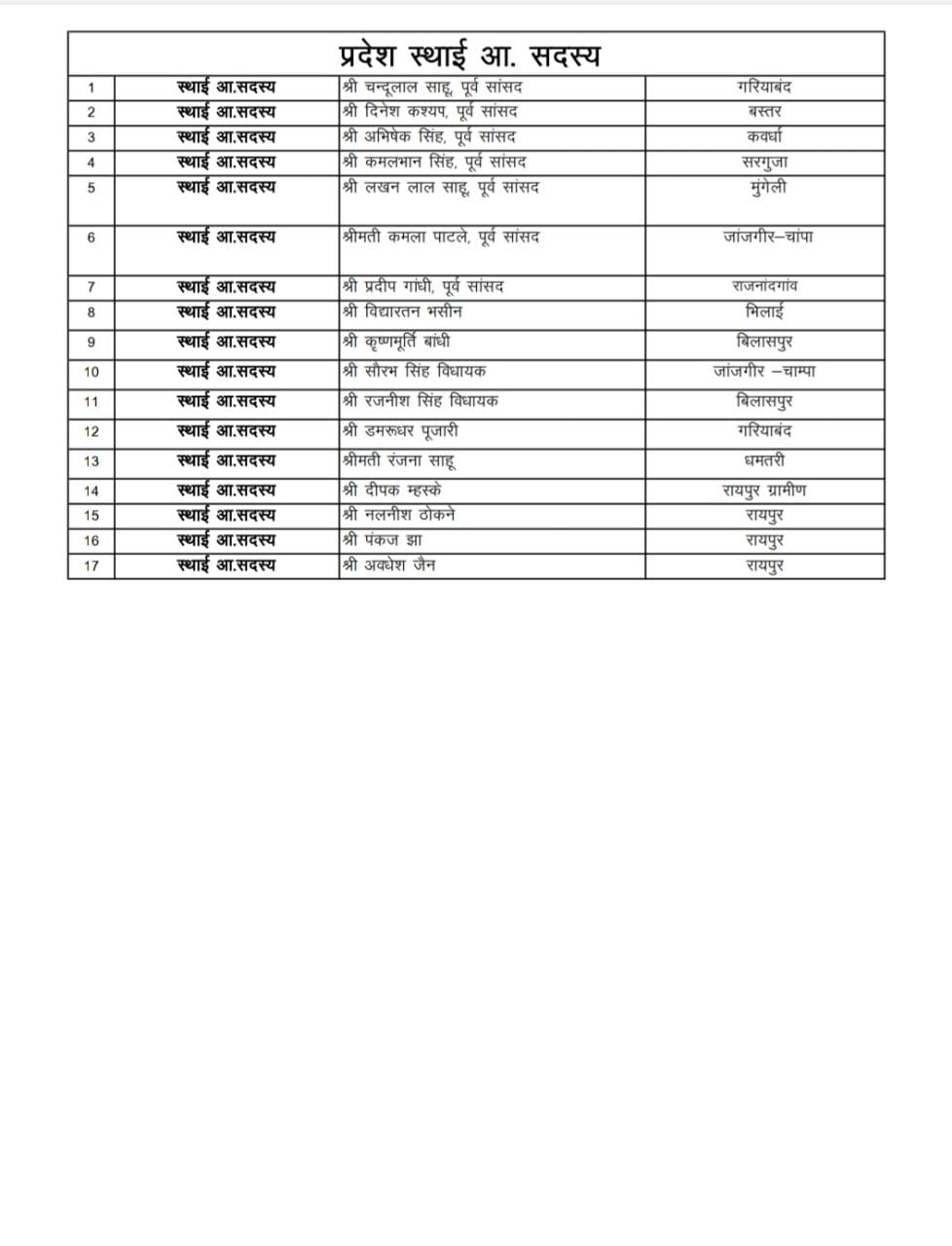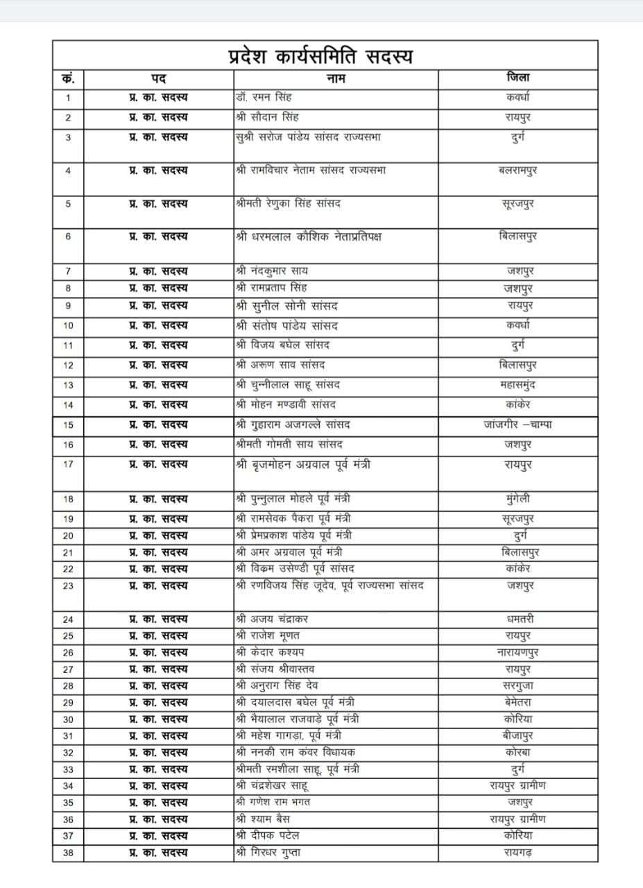 काफी इन्तजार के बाद आख़िरकार भारतीय जनता पार्टी छत्तीसगढ़ की प्रदेश कार्यकारिणी की घोषणा कर दी गयी है .प्रदेश कार्यसमिति सदस्य में रमन सिंह, बृजमोहन अग्रवाल, सरोज पांडे, रामविचार नेताम समेत 40 नेताओं को अलग-अलग जिले में जगह मिली है.जिसके अध्यक्ष विष्णुदेव साय और उपाध्यक्ष शिवरतन शर्मा बनाए गए हैं.प्रदेश महामंत्री (संगठन) पवन साय बने है.नलीनेश ठोकने मीडिया प्रभारी बनाये गए है.सूची में प्रदेश विशेष आमंत्रित सदस्य में 36 नेताओं को जिम्मेदारी दी गई है. प्रदेश स्थाई आमंत्रित सदस्य में 83 नेताओं को जगह मिली है.देखिये पूरी सूची