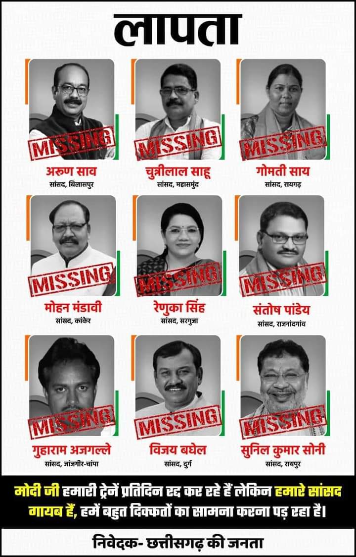 🌐 छत्तीसगढ़ में ट्रेन कैंसिल होने के कारण छग कांग्रेस ने भाजपा सांसदों में मिसिंग वाले पोस्टर जारी किए🌐
